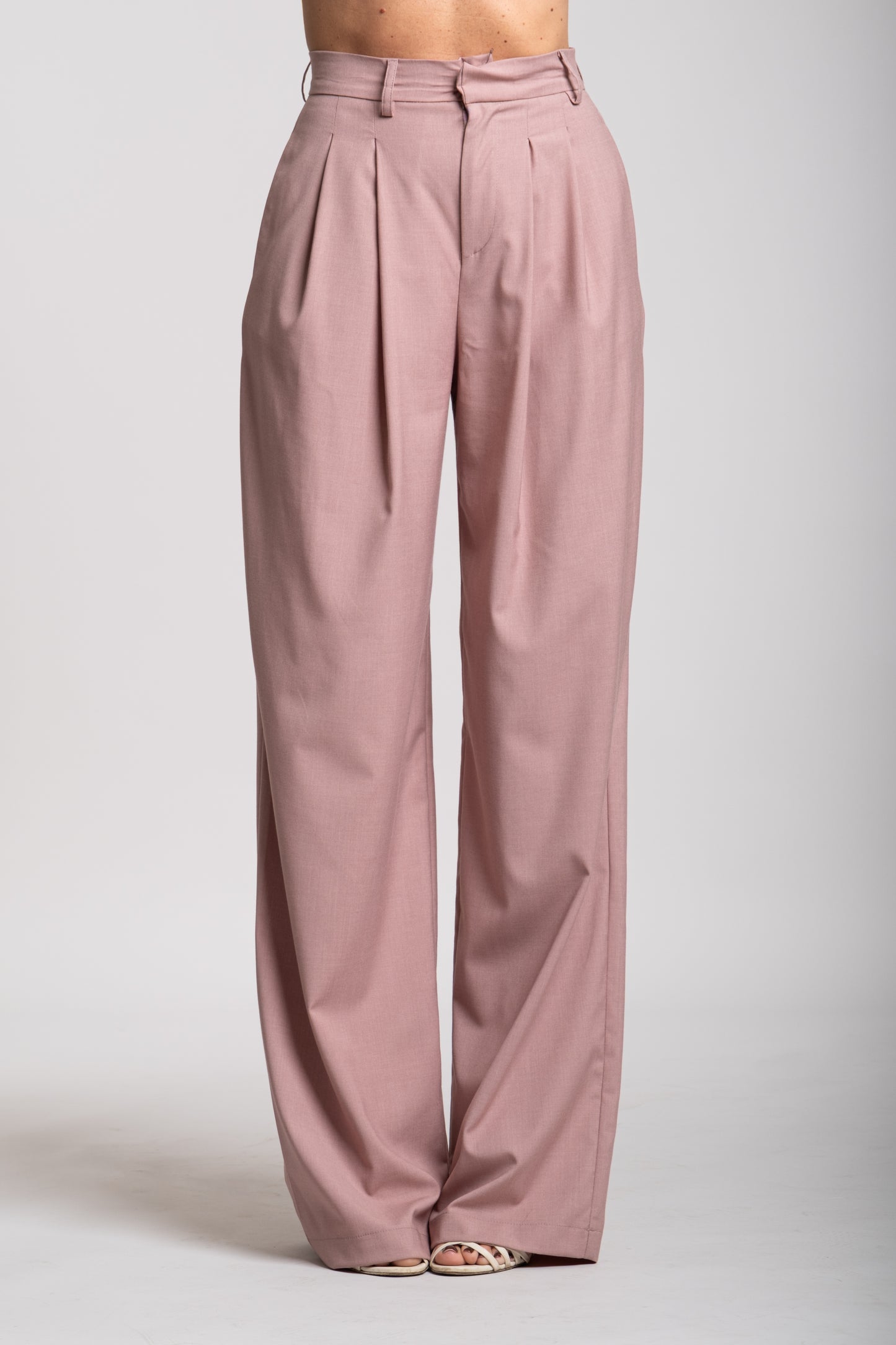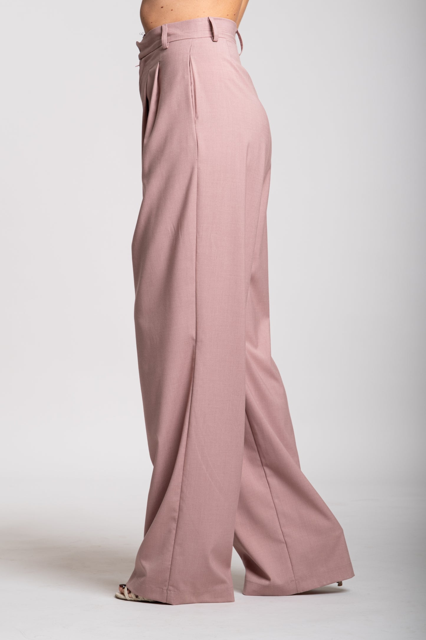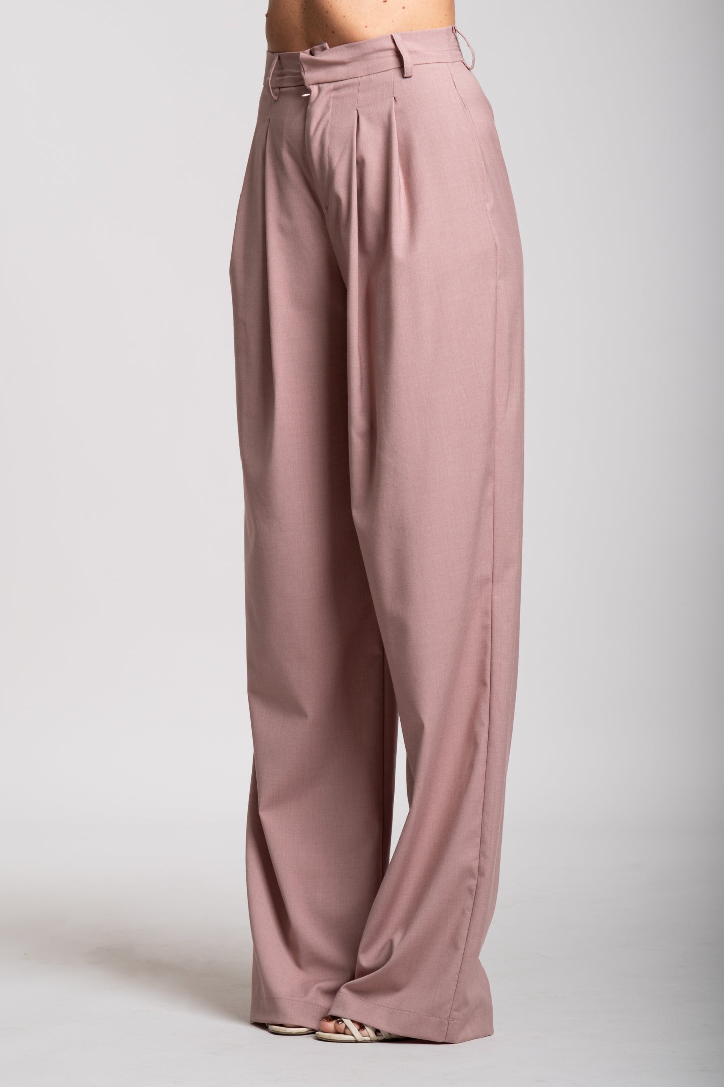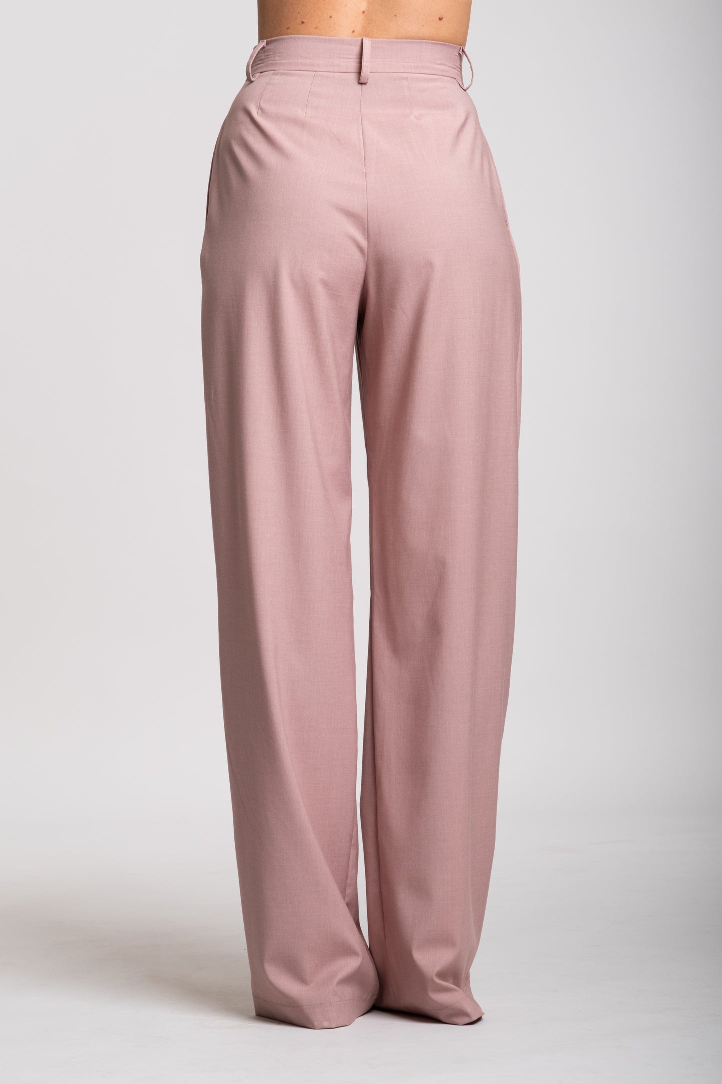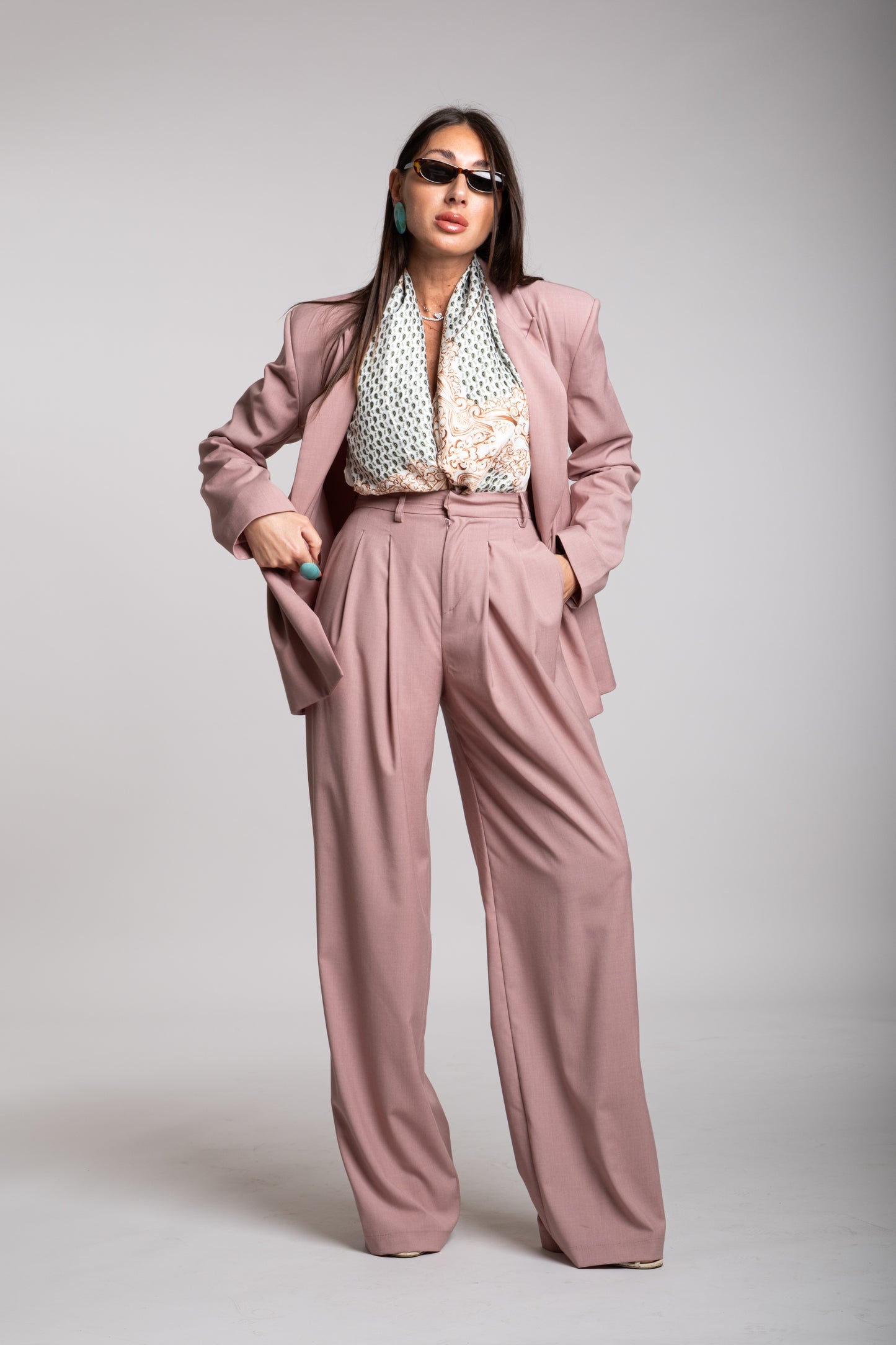 I pantaloni sono ampi e fluidi, a gamba dritta, con una caduta morbida che sfiora le scarpe. Questo taglio dona movimento e leggerezza al completo, bilanciando la struttura più rigida della giacca.