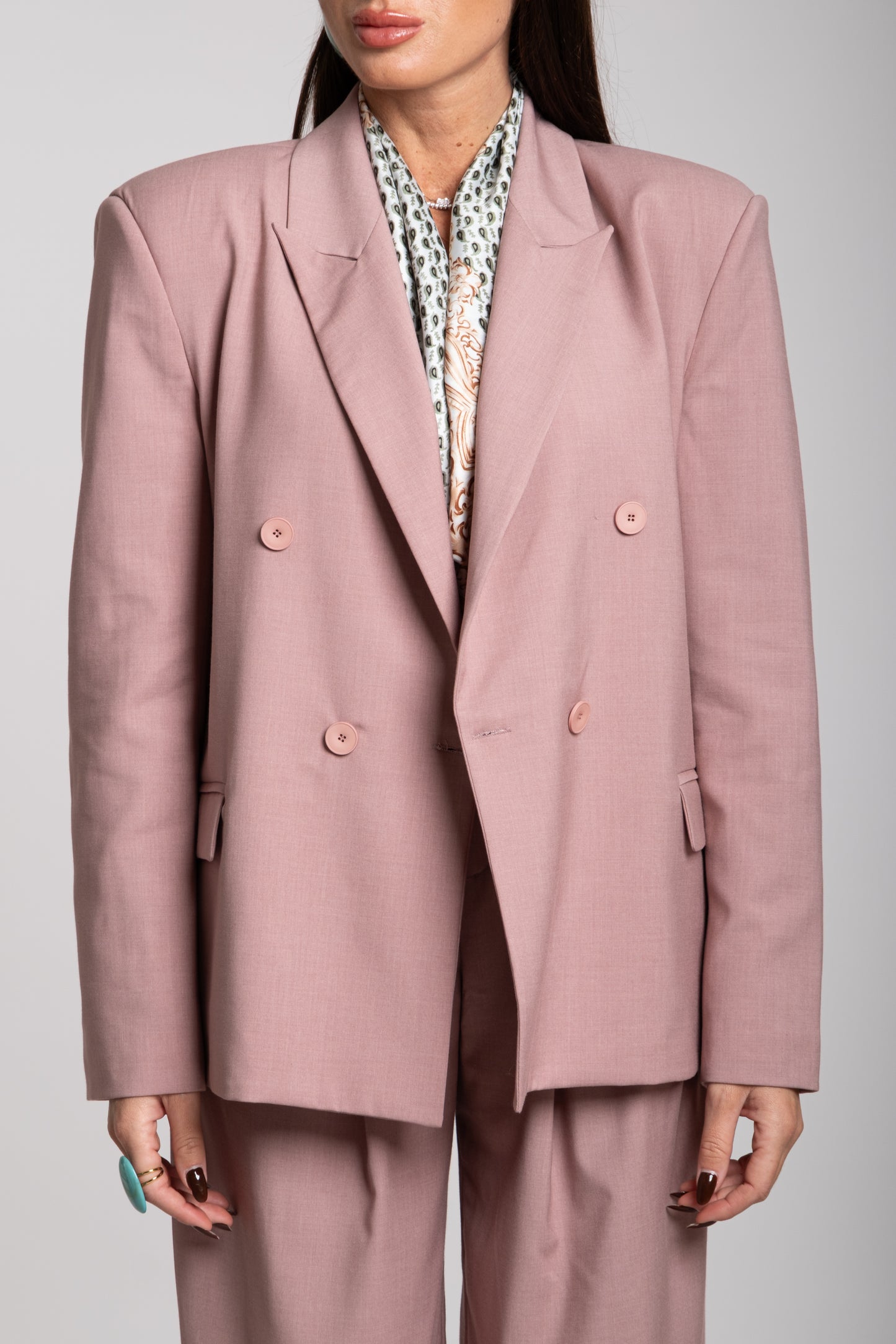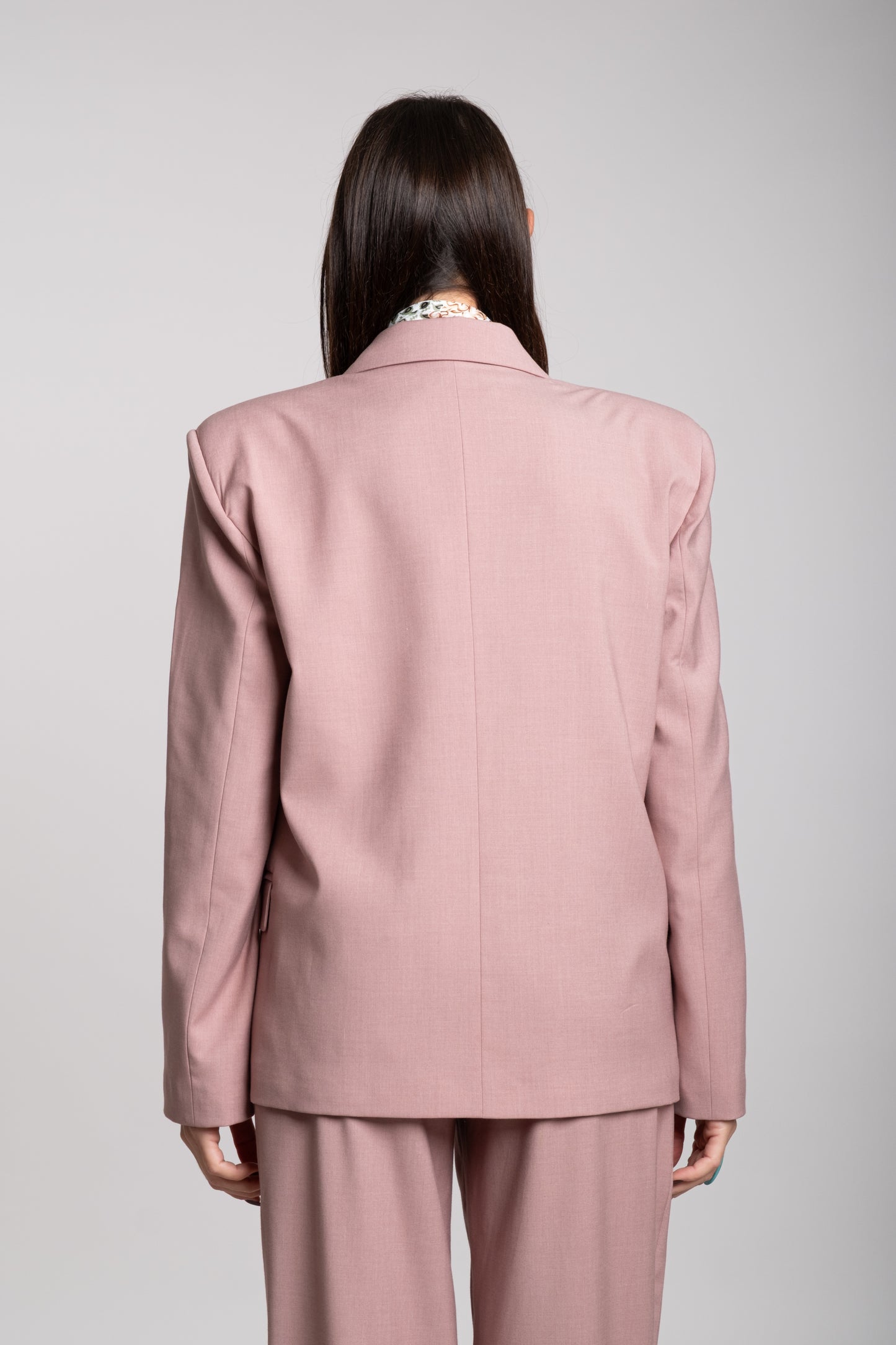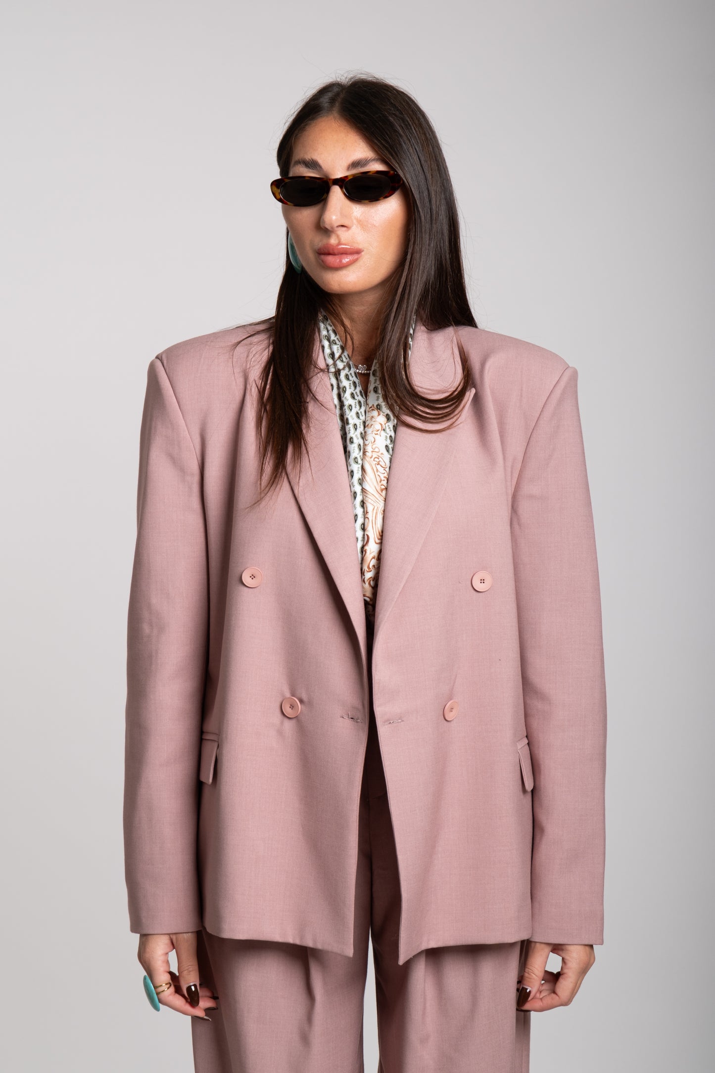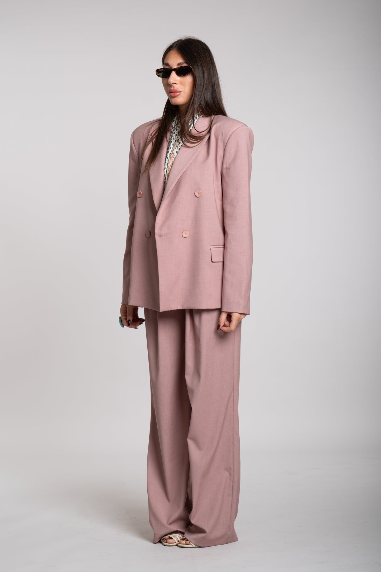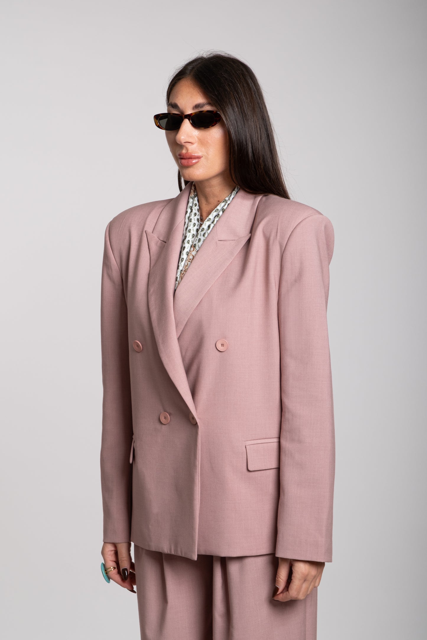 La giacca è doppiopetto, con una struttura decisa e spalle leggermente imbottite che enfatizzano una silhouette forte e sofisticata. I revers sono ampi e classici, mentre i bottoni, disposti in doppia fila, contribuiscono a un’estetica formale ma attuale. La vestibilità è leggermente oversize, conferendo un’aria rilassata ma molto chic.