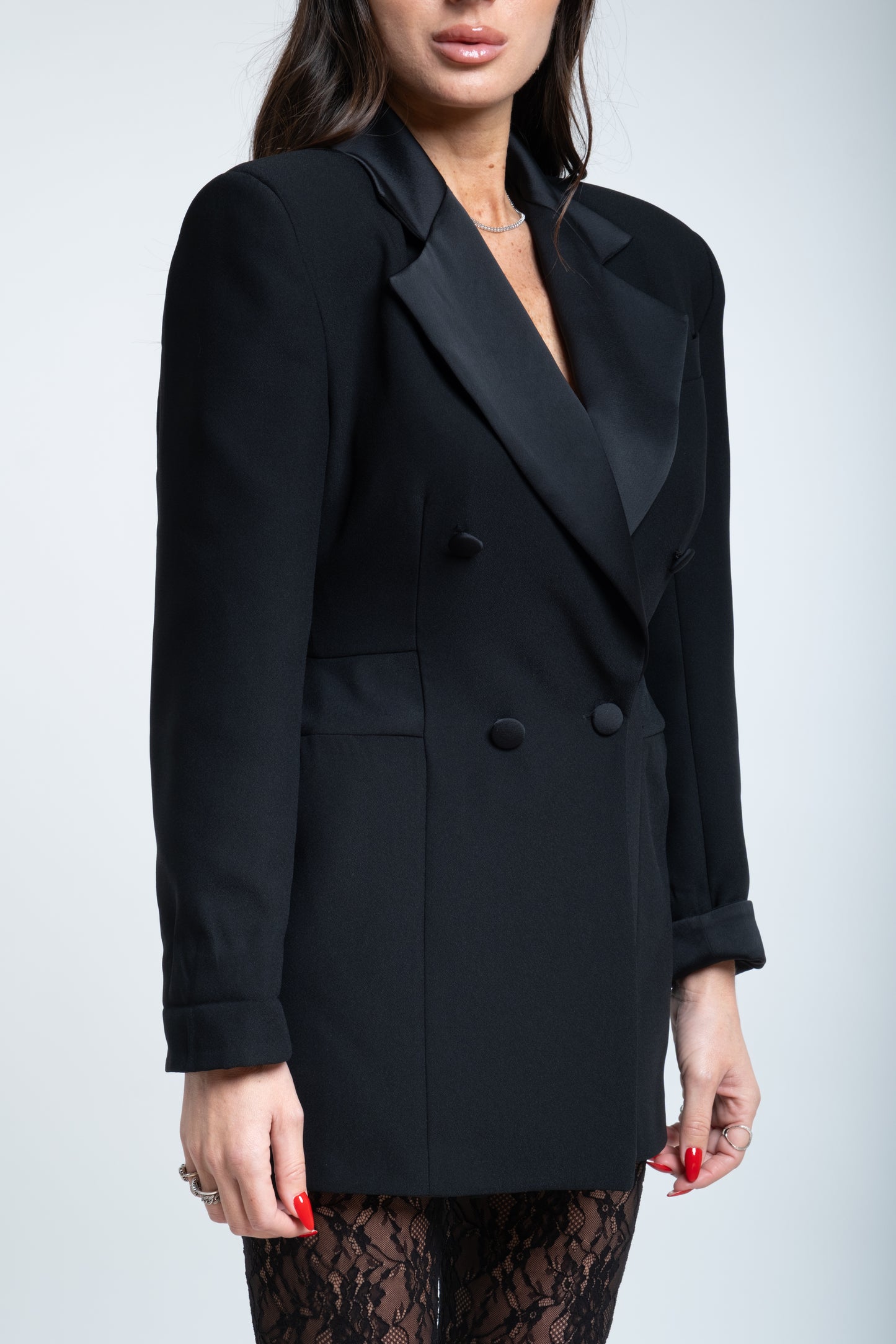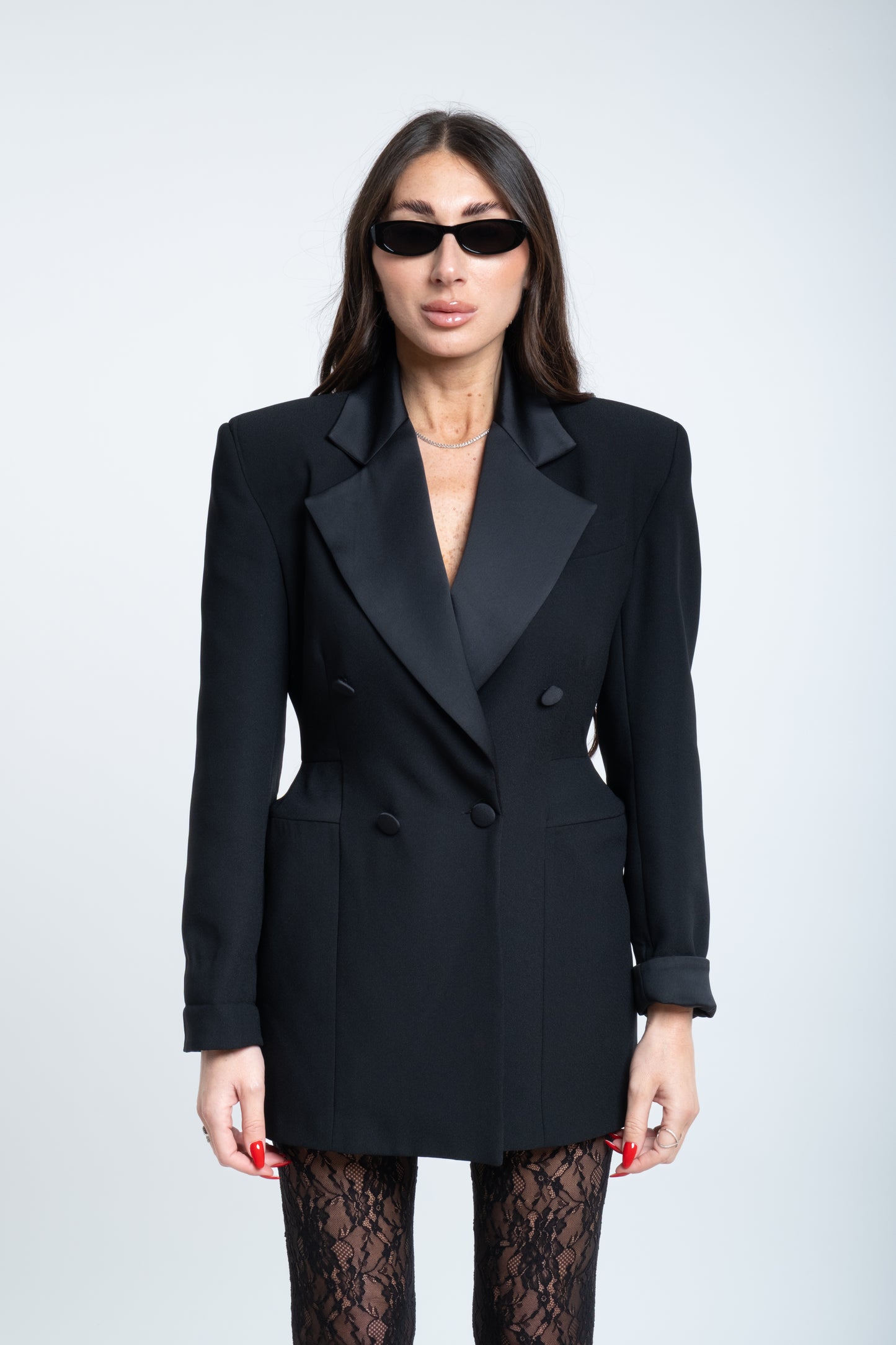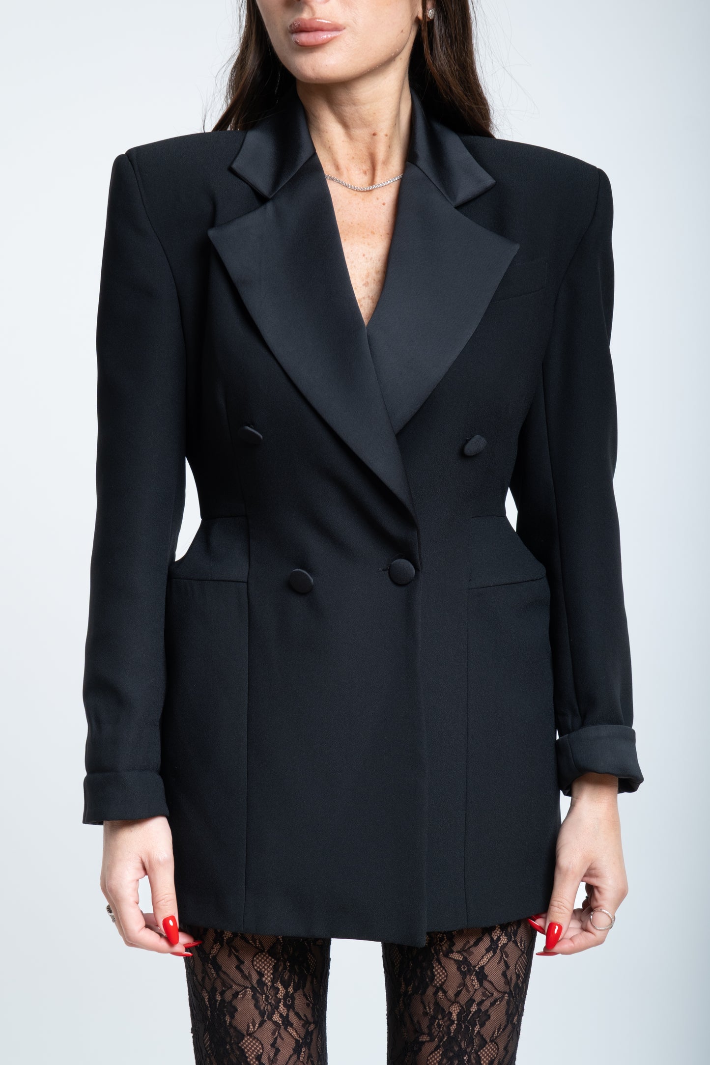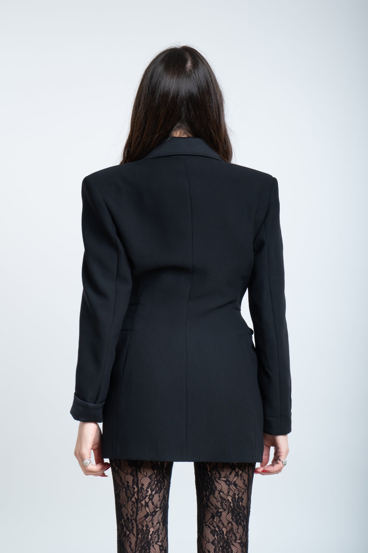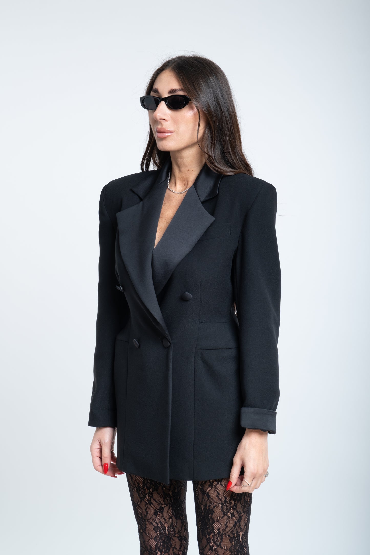 Un abito a giacca è un capo raffinato che unisce la struttura impeccabile del blazer alla femminilità di un abito sartoriale. Realizzato con linee pulite e un taglio preciso, presenta una giacca incorporata che funge da corpino, spesso caratterizzata da revers classici, spalle leggermente definite e una chiusura frontale a bottoni.