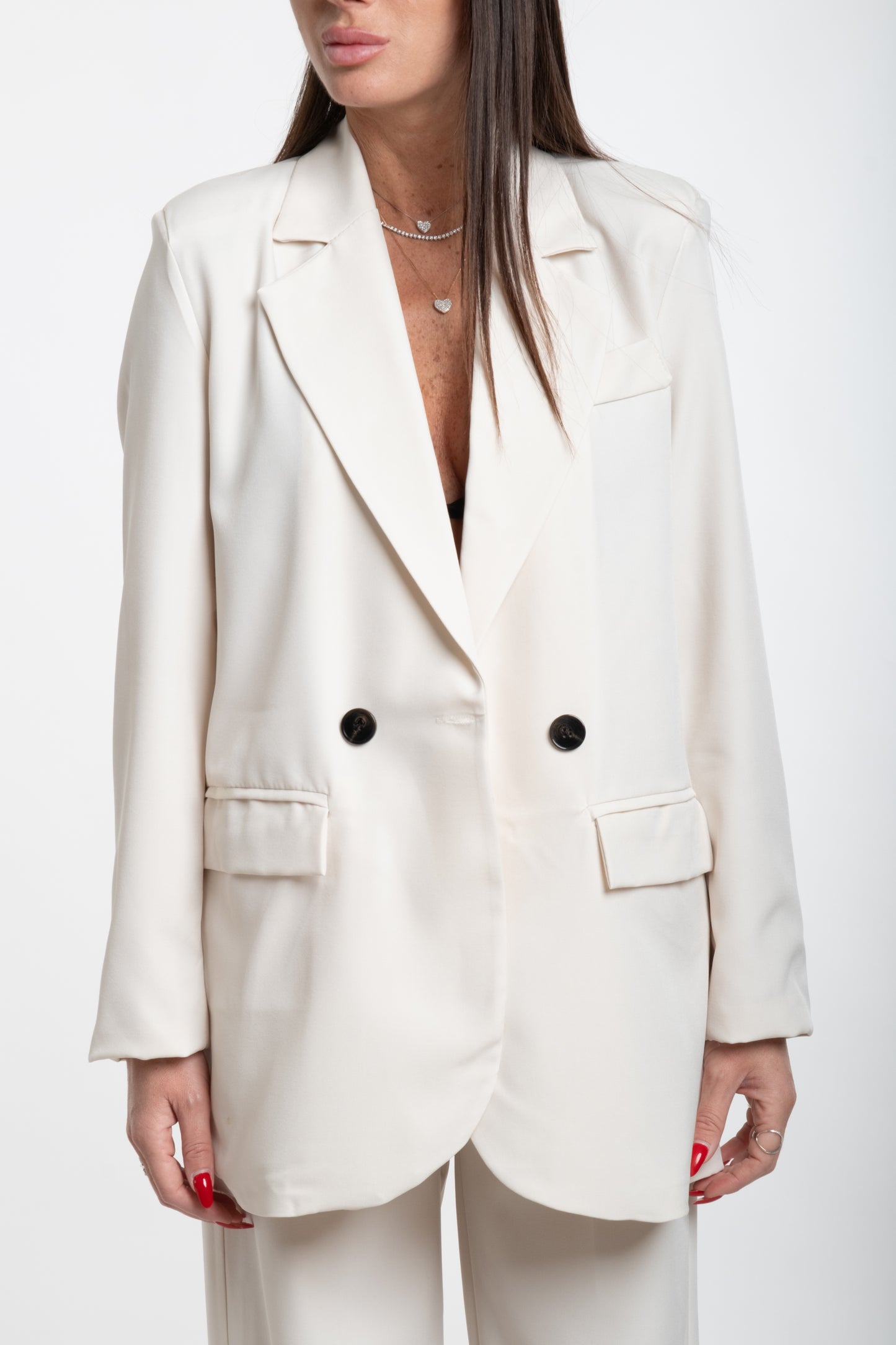 Elegante e versatile, questo tailleur taglia unica è pensato per adattarsi perfettamente a diverse fisicità, dalla taglia S alla XL, grazie al suo taglio morbido e all'elastico del pantalone sul retro. Il completo è composto da giacca e pantalone coordinati, caratterizzati da una linea moderna e raffinata.