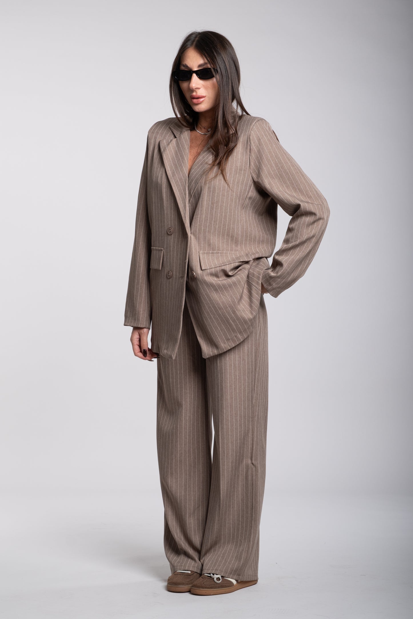 Elegante e versatile, questo tailleur taglia unica è pensato per adattarsi perfettamente a diverse fisicità, dalla taglia S alla XL, grazie al suo taglio morbido e all'elastico del pantalone sul retro. Il completo è composto da giacca e pantalone coordinati, caratterizzati da una linea moderna e raffinata.